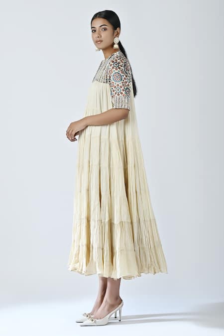 Beige dress in crepe and German satin featuring intricate gathered tiered flare and Ajrakh print yoke