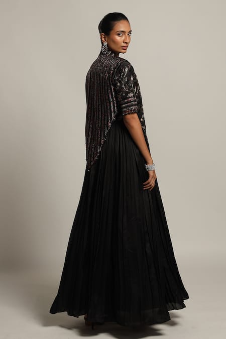 Black gathered gown featuring a V neckline and half sleeves. Paired with a cut pipe embellished jacket in a leaf pattern with a mandarin collar.
