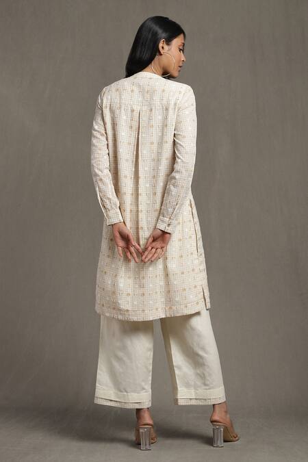 Beige straight kurta featuring self design patterns and front button closure. Paired with matching palazzo with checkered hem detail.