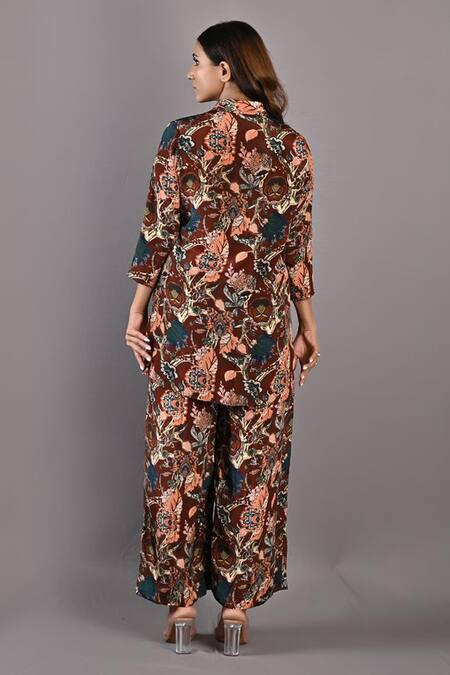 Maroon crepe button down shirt with multi color floral print & collar. Paired with printed flared pants with side pockets.