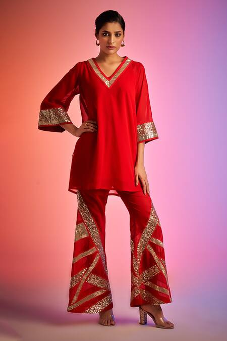 Buy_Gulabo By Abu Sandeep_Red Sequin Embellished Bell Bottom Pant _Online_at_Aza_Fashions