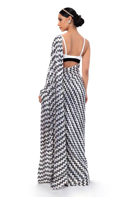 Ivory chiffon saree with black and white self sequins embroidery in chevron pattern. Paired with black velvet and white silk patch blouse & ivory satin in-skirt.