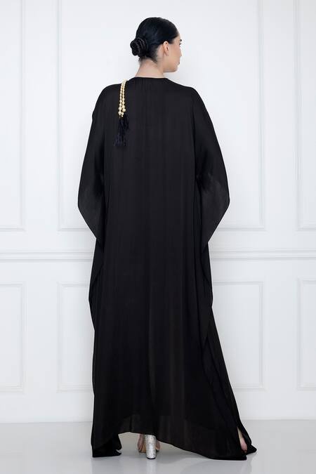Black cotton satin kaftan with golden sequins embellished details and tassel.