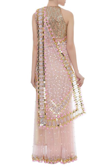 Cream Tulle Sequins, Acrylic Mirrors Halter Embellished Saree With Blouse