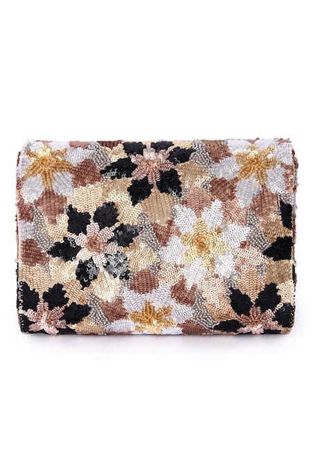Gold clutch featuring floral sequin embroidery and tassel latkan
