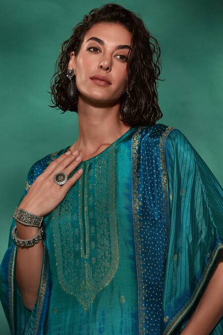 Buy_Label Varsha_Blue Viscose Tassels Round Neck Sequin Embroidered Kaftan And Pant Set_at_Aza_Fashions