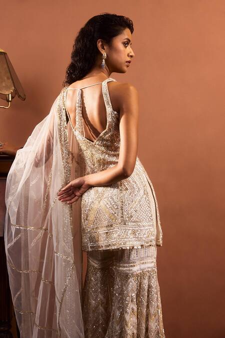 Ivory short kurta with all-over metallic silver-gold sequins in a chevron pattern. Paired with a fully embroidered gharara and an ivory net dupatta.