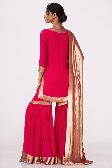 Rani pink short kurta highlighted with sequin sheeted yoke, mandarin collar & straight silhouette. Comes with sharara & dupatta.