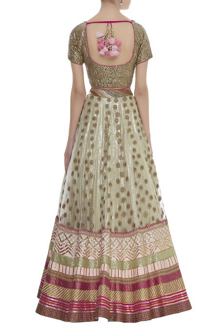 This sequin embroidered gold blouse with silver gota patti embroidered flared lehenga set characterizes romanticism and feminism.