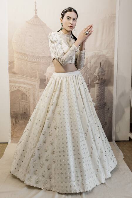 White lehenga with sequin, geometric embroidery. Paired with high neck blouse & dupatta.