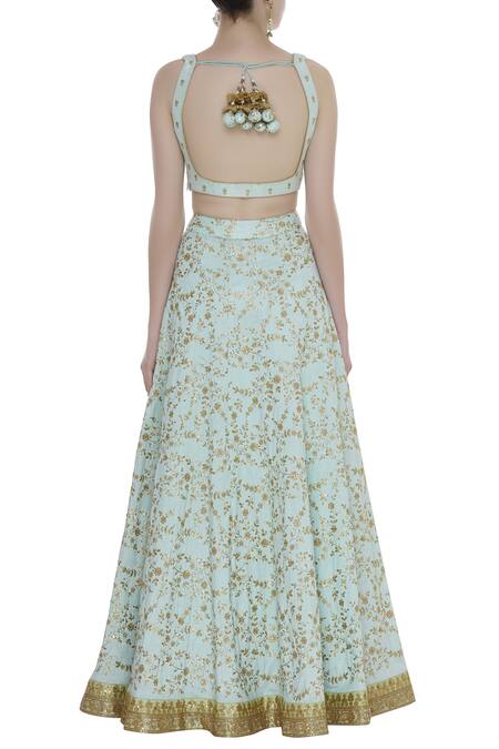 A pastel hue this wedding season; this sky blue zari and sequin work blouse along with fully loaded zari and sequin work lehenga with printed organza dupatta.