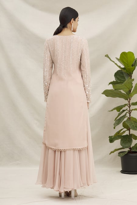 Peach kurta with all-over sequin embroidery and key hole at the front. Paired with palazzo and dupatta.