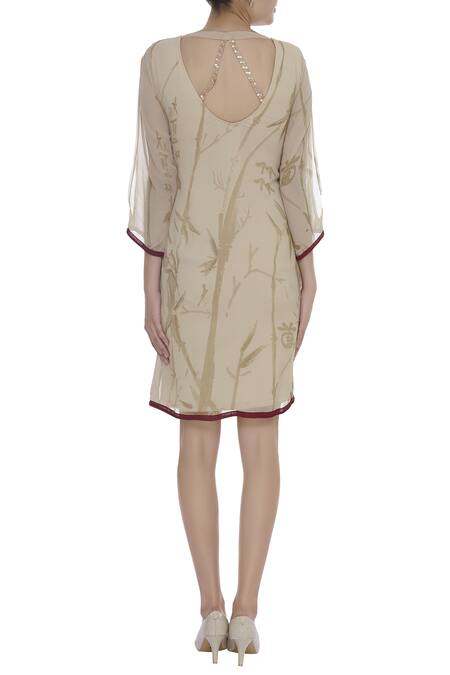 Beige dress with embellished detail & cutout sleeves.