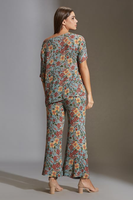 Turquoise one shoulder top with floral printed motifs & sequin work. Paired with floral print & sequin work pant.