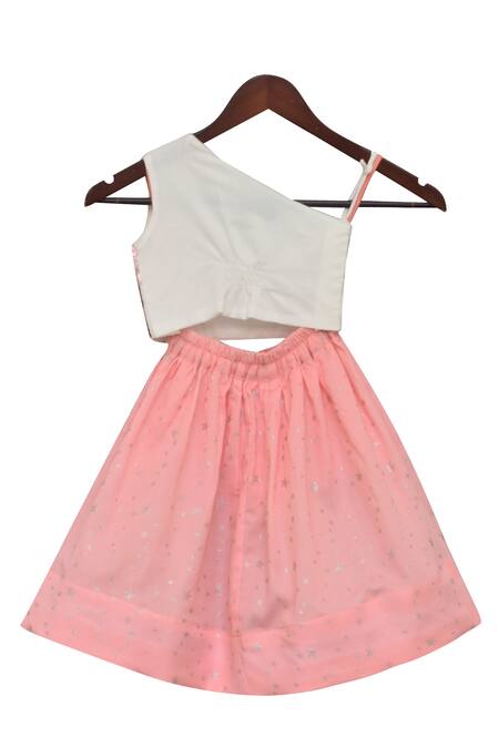 Let your little one sparkle and shine as she wears this white, one-shoulder top embellished with multi-color sequins and paired with peach hued, pleated skirt adorned with starry details. The skirt is decked with a tiny sequin embroidered attached pocket.