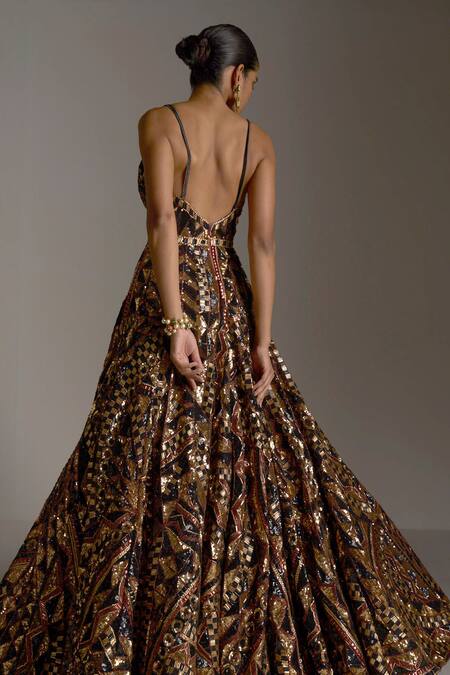 Buy_Seema Gujral_Brown Net Geometric Plunge V Neck Sequin Work Flared Gown_at_Aza_Fashions