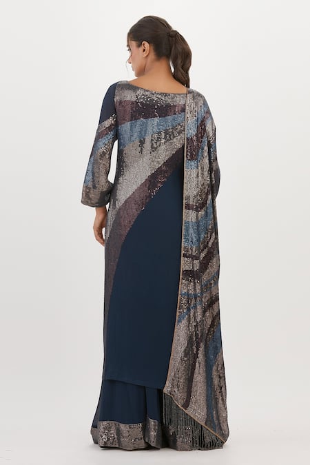 Blue kurta featuring sequin embroidery, boat neckline & flared sleeves. Paired with embroidered hem farshi palazzo and fringed dupatta.