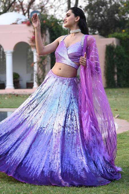 Lilac net lehenga in ombre sequin work with ostrich feather side tassel. Paired with a wrap style choli and embroidered dupatta.