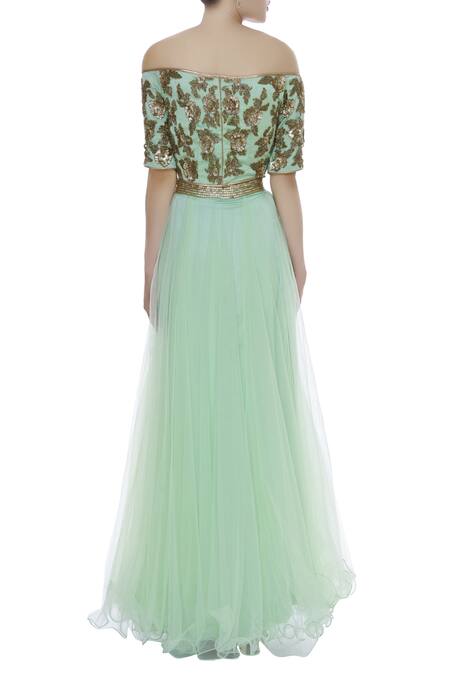 Green Net Embroidered Off Shoulder Sequin And Zardozi Lehenga Set