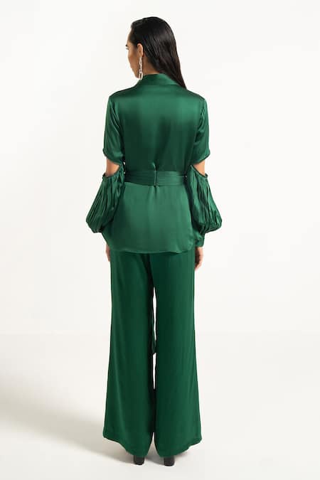 Bottle green silk shirt with cutout detail at the sleeves, spread collar and tie up front. Comes with separate fabric belt.