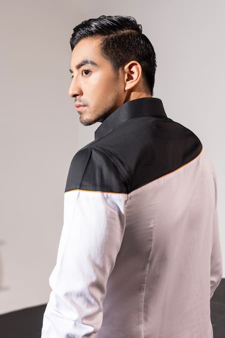 Black and white colorblock shirt featuring orange piping work on the yoke