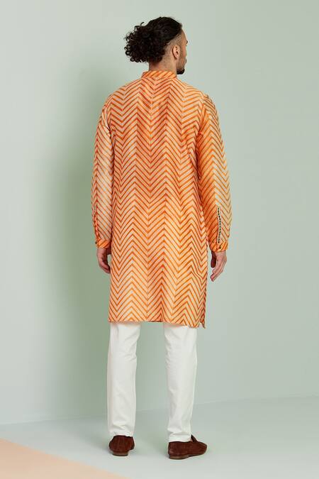 Orange kurta with shibori print and embellished placket.