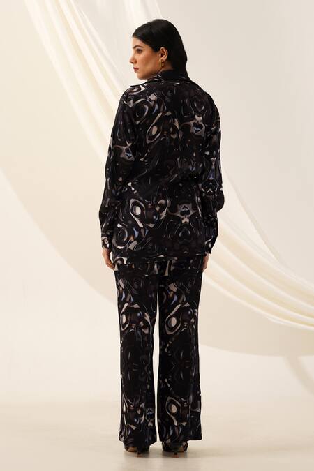 Black shirt featuring an abstract print with cuff sleeves. Paired with coordinating pants for a complete look.
