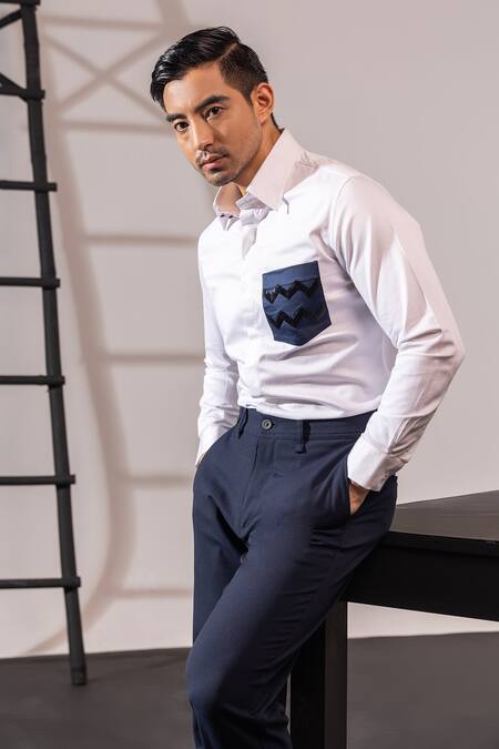 White shirt featuring a collar and full sleeves with cutdana placement embroidery in a chevron pattern on the pocket