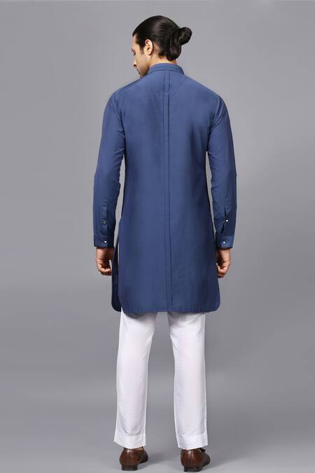 Dusty blue kurta with embroidery on the patch pocket and leather detailing. Paired with white straight pant.
