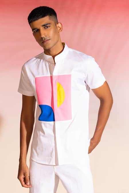 White shirt featuring graphic patchwork embroidery and a mandarin collar