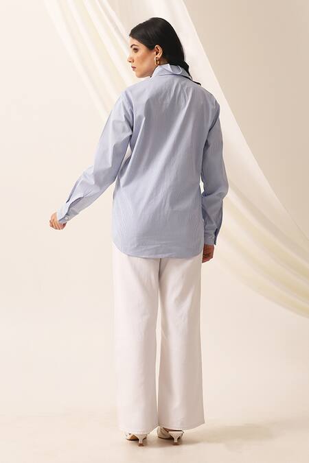Blue shirt featuring an abstract pattern on the front with cuffed full sleeves