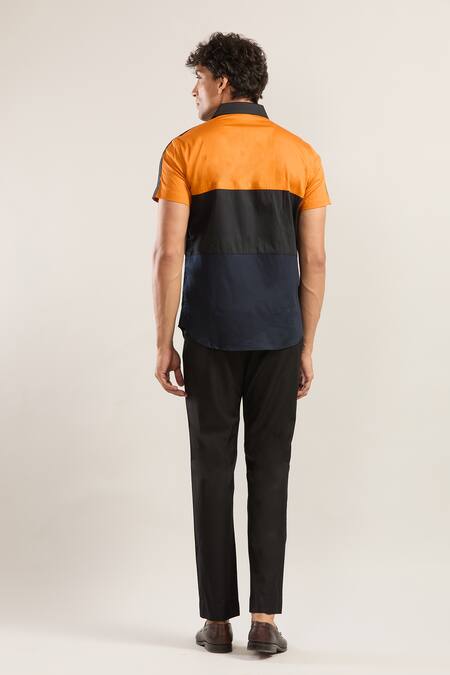 Orange, black & blue color blocked shirt featuring figurine embroidered pocket