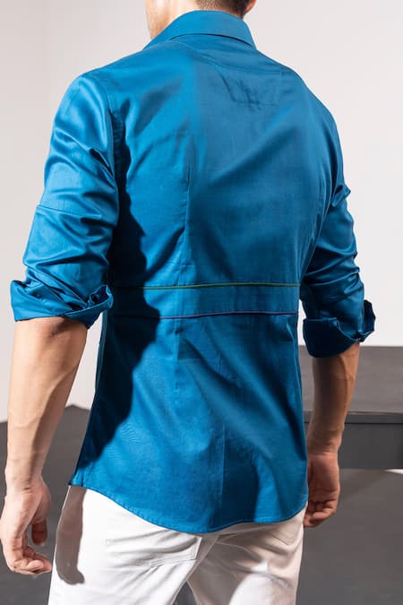 Blue cotton shirt featuring full sleeves and multicolor pockets