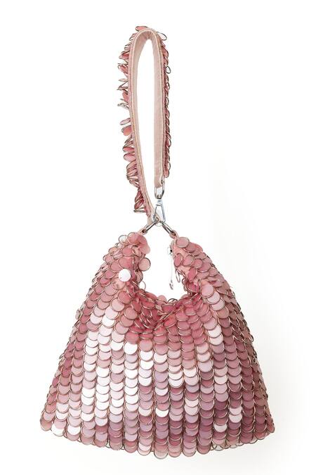 Rose pink velvet handbag adorned with all-over sequins and ring chain embellishments
