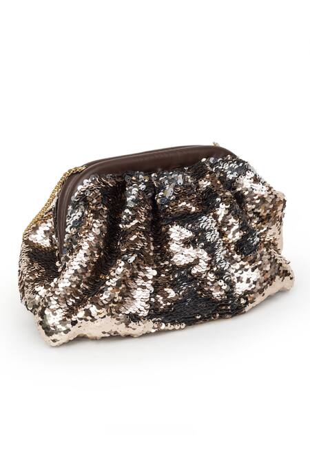 Gold and brown clutch bag featuring all-over reversible sequin embellishments