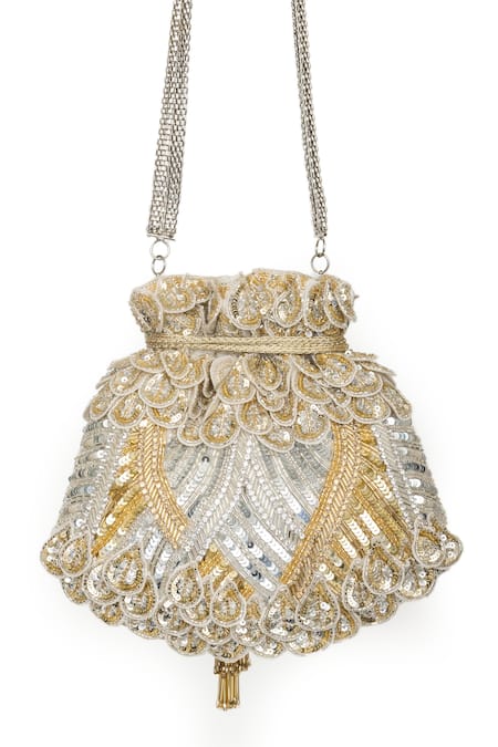 Gold and silver potli bag featuring all-over cutdana, sequins, and crystal embellishments