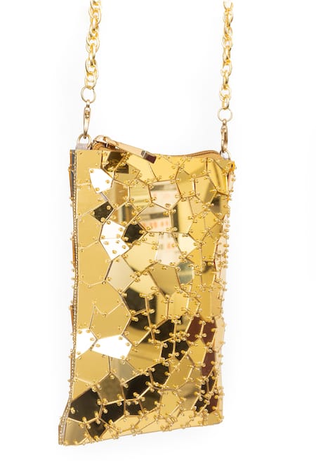 Gold phone sling bag featuring abstract acrylic embellishments. Comes with a detachable chain handle.
