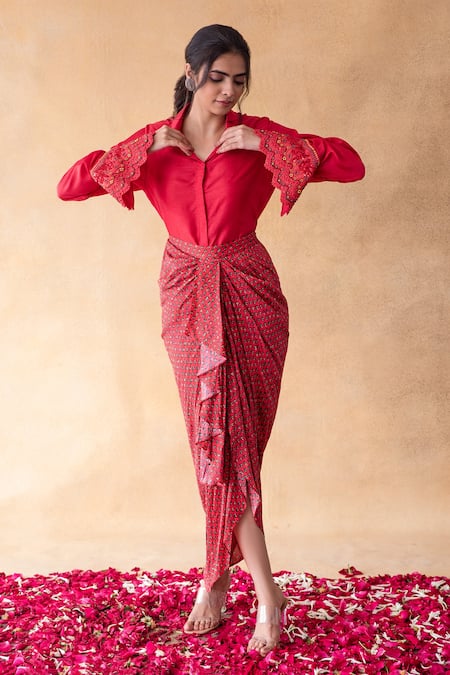 Red Dupion Silk Floral Collared Neck Bell Sleeves Top And Draped Skirt Set