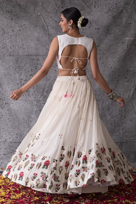 White lehenga in dupion silk base with floral print. Paired with thread, sequin, bead blouse.