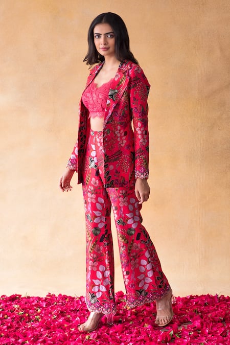 Dark rose pink blazer and flared hem pant in dupion base with floral print. It is paired with a matching floral lace work blouse.