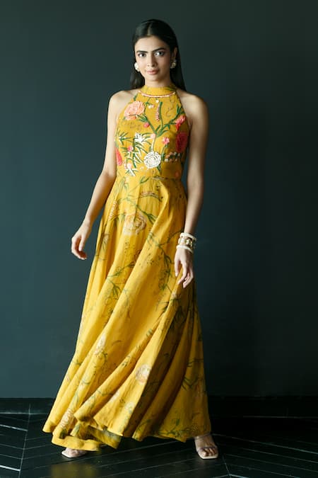 Yellow floral print maxi dress featuring a halter neck design with thread, sequin, and beads embroidery on the bodice