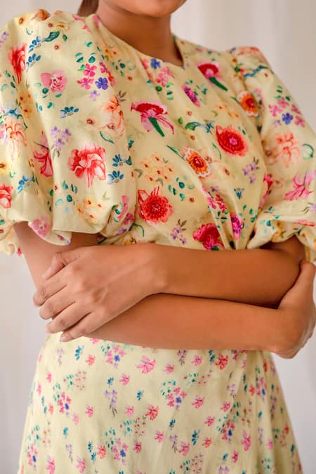 Buy_Shachi Sood_Yellow Dupion Silk, Butter Crepe Floral Round Printed Maxi Dress _at_Aza_Fashions