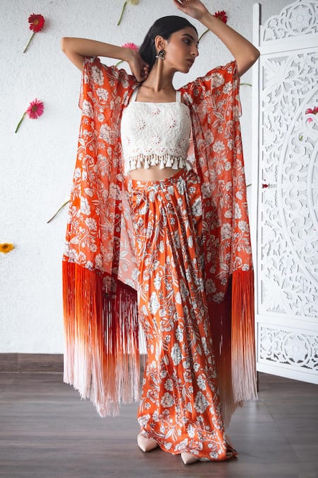 Orange dupion silk floral print pleated skirt paired with a white embroidered top. The ensemble is complemented by an organza jacket featuring thread shaded tassels.