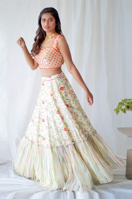 Light yellow hand embroidered padded top with a printed base. Paired with printed, attached can can skirt. Comes with a dupatta with sequin work.