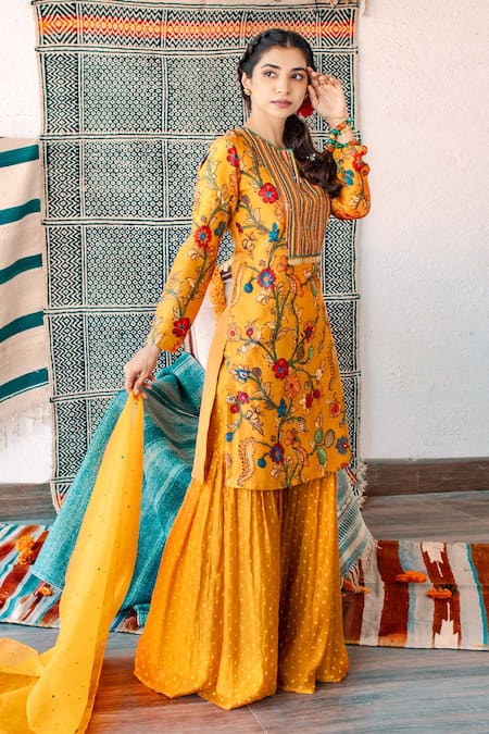Buy_Shachi Sood_Yellow Dupion Silk, Fine Chanderi Beads And Sequins Embroidery, Kurta Sharara Set _Online_at_Aza_Fashions