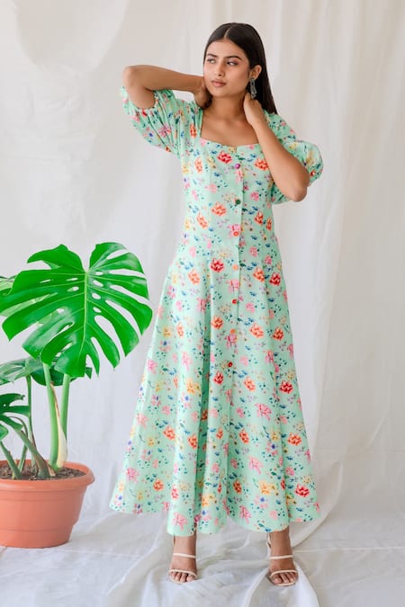 Sea green dupion silk printed floral dress with sequin embroidered buttons.