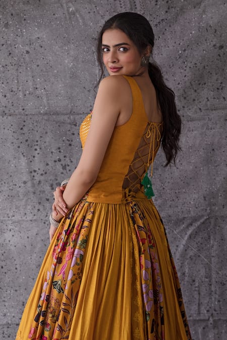 Mustard lehenga in dupion silk base with floral print. Paired with thread, sequin, bead hand embroidered blouse and organza base all over lace border dupatta.