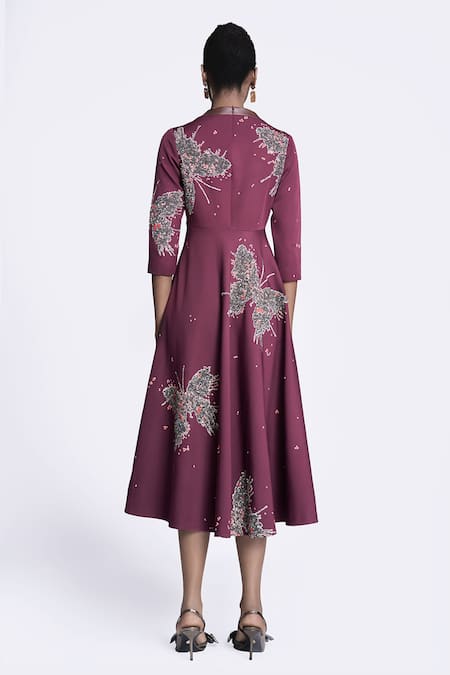 Wine midi dress featuring thread embroidery in a butterfly splashes pattern
