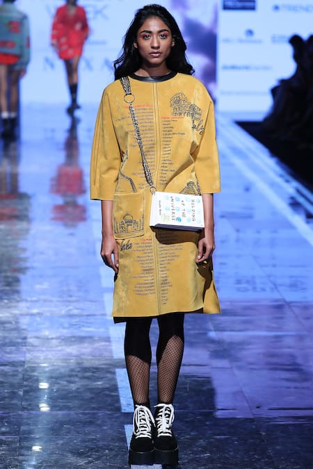 Mustard kaftan style dress with embroidered & leather detail on it.