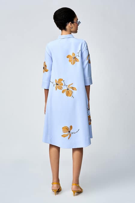 Blue midi dress featuring scattered magnolia embroidery and a collared neck